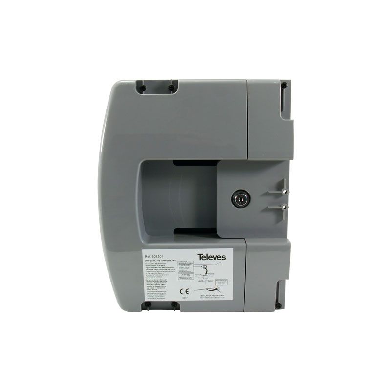 Το TELEVES 507203 είναι ένα κυτiο με κλειδαριά και ανεμιστήρα, για εύκολη τοποθέτηση επαγγελματικών μονάδων headend της σειράς TELEVES T.0X. Ενσωματώνει ενεργό σύστημα εξαερισμού με φτερωτή και έχει κλειδαριά ασφαλείας. Μπορει να δεχτεί έως και 7 μονάδες modules της σειράς Τ.0Χ headend και ένα επίσης modular τροφοδοτικό 5629. Μπορεί να τοποθετηθεί σε κάθετες επιφάνειες και περιλαμβάνει ράγες DIN για την αγκύρωση των modules στο εσωτερικό του. Εξασφαλίζει την σταθερή, αξίοπιστη και ασφαλή λειτουργία κάθε επαγγελματικής εγκατάστασης headend, με modules της σειράς Τ.0Χ της TELEVES.