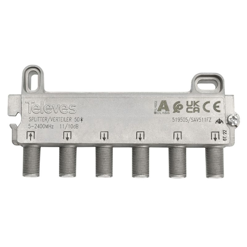Ο Televes 519505 είναι ένας ALL-BAND διακλαδωτής 5 Εξόδων, κατασκευασμένος απο μεταλλικό κράμα Ζamak , με διέλευση DC απο τις Εξόδους προς την Είσοδο. Διαθέτει τις συνδέσεις F όλες σε μία πλευρά για ευκολία σύνδεσης των καλωδίων με τα φις F, αλλά και κλίση 10 μοιρών κατα την τοποθέτηση, για την διευκόλυνση βιδώματος των φις F, επάνω στον διακλαδωτή. Η εξασθένιση του σήματος κατα την διέλευση απο τον διακλαδωτή είναι πολύ χαμηλή, χάρη στην κατασκευή του κυκλώματος του με μικρο-υλικά βελτιώνωντας την απόδοση του, ενώ το κέλυφος του απο κράμα Zamak, παρέχει ηλεκτρομαγνητική θωράκιση Class A. Είναι σχεδιασμένος για εγκατάσταση σε εσωτερικό χώρο αλλά και σε ράγα ερμαρίου. Σε εξωτερικό χώρο, μπορεί να τοποθετηθεί εντός κυτίου 4163.