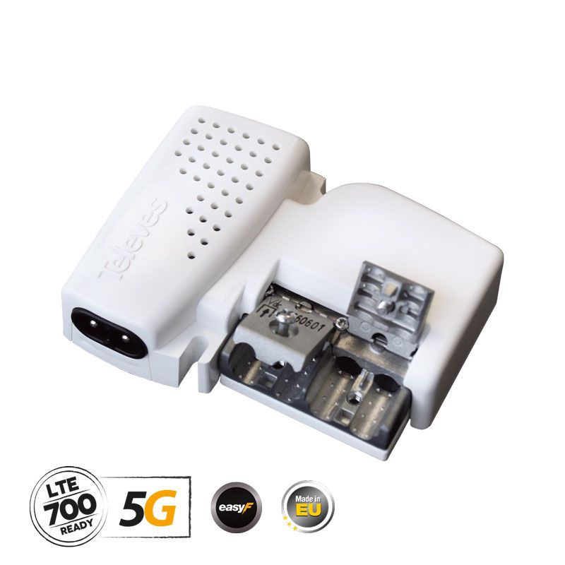 O εξαιρετικά προηγμένος ενισχυτής γραμμής TELEVES 560601 PicoKom ΕΝΙΣΧΥΤΗΣ ΓΡΑΜΜΗΣ AGC UHF/VHF/SAT 2out 5G LTE, προσφέρει λειτουργία Plug & Play για τις μπάντες UHF/VHF/FM και ΔΟΡΥΦΟΡΙΚΟ, μαζί με επιλογή ΕΝΙΣΧΥΤΗ ΔΟΡΥΦΟΡΙΚΟΥ σήματος (όταν ενεργοποιηθεί το DC OUT απο τον διακόπτη στο πίσω μέρος). Διαθέτει συμπαγή και πολύ μικρών διαστάσεων κατασκευή, ενώ παρέχει ενίσχυση splitband στα VHF/UHF και διαθέτει ενσωματωμένο switching τροφοδοτικό. Σημαντικο χαρακτηριστικό του αποτελεί ο διακόπτης ON/OFF στην πίσω πλευρά, για ενεργοποίηση εξόδου τροφοδοσίας DC προς κεραίες Televes TForce BOSS, ενεργά δίπολα , κλπ, καθώς και για την ενεργοποίηση της ΕΝΙΣΧΥΣΗΣ ΔΟΡΥΦΟΡΙΚΟΥ ΣΗΜΑΤΟΣ, ενώ η λειτουργία Automatic Gain Control (AGC) στα UHF/VHF, συνεχώς επιβλέπει και αυτορυθμίζει το σήμα στις μπάντες αυτες, με σκοπό να παρέχει την βέλτιστη στάθμη σήματος προς τις τηλεοράσεις. Είναι κατασκευασμένος απο κράμα Zamak για αντιδιαβρωτική προστασία και ηλεκτρομαγνητική θωράκιση. Διαθέτει συνδέσεις Εasy-F για γρήγορη, σίγουρη και εύκολη σύνδεση των καλωδίων, χωρίς την ανάγκη προσθήκης βυσμάτων.