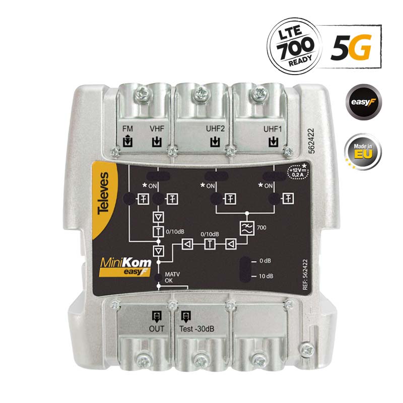 O ενισχυτής κεντρικών εγκαταστάσεων με αποκοπή 5G παρεμβολών, TELEVES 562422 διαθέτει 4 εισόδους σήματος ( 2x UHF, VHF, FM ) με ανεξάρτητα μεταξύ τους κυκλώματα ενίσχυσης, τα οποία αποτρέπουν προβλήματα στην εγκατάσταση απο φαινόμενα ενδοδιαμόρφωσης μεταξύ των εισόδων. Οι είσοδοι UHF και VHF, διαθέτουν ρυθμιζόμενη απολαβή και επιπλέον, ο ενισχυτής διαθέτει κεντρικό διακόπτη ΥΨΗΛΗΣ/ΧΑΜΗΛΗΣ απολαβής για αποκοπή σταδίου, ώστε να αποφεύγεται η υπερενίσχυση και τα προβλήματα τα οποία αυτή δημιουργεί, χωρίς να αλλοιώνεται η ποιότητα και ποσότητα του σήματος εξόδου λόγω εισαγωγής εξασθένισης. Ο ενισχυτής 562422 διαθέτει επίσης 1+1 έξοδο σήματος (κύρια + TEST -30db) και συνδέσεις EASY-F για ευκολία, αξιοπιστία και θωράκιση της σύνδεσης, ενώ είναι κατασκευασμένος απο μεταλλικό κράμα Zamak, για αντιδιαβρωτική και ηλεκτρομαγνητική προστασία. Το ενσωματωμένο τροφοδοτικό του είναι switch-mode, για χαμηλή κατανάλωση ενέργειας.