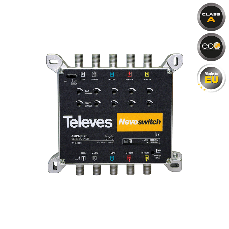 Το Televes 714509 Nevoswitch Amplifier 5x5 ''F'' MATV/BIS G 27/25dB Vo 115dB΅V είναι ενισχυτής δορυφορικών πολώσεων και επίγειου σήματος και παρέχει πλήρη δυνατότητα ρυθμίσεων για άριστη προσαρμογή στις αναγκες της εγκατάστασης σε δίκτυο διαδοχικών πολυδιακοπτών NevoSwitch. Κατασκευασμένο απο κράμα zamak προστατεύεται απο τις παρεμβολές και μπορεί να τοποθετηθεί σε διαδοχικές και τερματικές εγκαταστάσεις. Διαθέτει ανεξάρτητη ρύθμιση της στάθμης των εξόδων (εκτός των συμβατών με QUAD μονάδων). Χάρη στην λειτουργία ECO mode, η κατανάλωση ρεύματος προσαρμόζεται ανάλογα με το επίπεδο χρήσης.