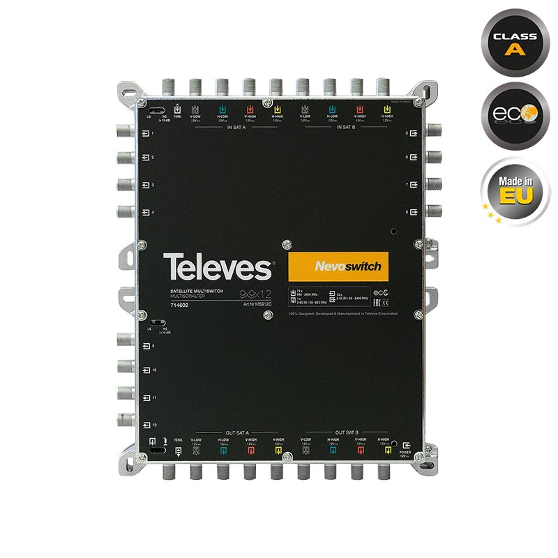 O 714602 NEVOSWITCH 9x9x12 ανήκει σε μιά νέα σειρά πολυδιακοπτών NEVOSWITCH της TELEVES. Με προσανατολισμό στον επαγγελματία και στην πλήρη ευελιξία της αρχικής εγκατάστασης αλλα και κάθε προγραμματισμένης ή απρογραμμάτιστης επέκτασης/προσθήκης, έχει την δυνατότητα να χρησιμοποιειθεί καί ως τερματικός και ώς διαδοχικός (cascadable). Μόνο με επιλογή 1 διακόπτη! Ευελιξία και στους τρόπους τροφοδοσίας: μέσω του Power DC Jack (12 Vdc) , μέσω του V-Low input (12 Vdc), μέσω των TERR input/οutput! Επιπλέον, δίνοντας 12 /18V σε οποιαδήποτε έξοδο, το DC τροφοδοτεί μεσω Terr και V-LOW input/output, προ-ενισχυτές, κεραίες B.O.S.S., LNB ή άλλους πολυδιακόπτες NEVOSWITCH, μέσω της επιλογής απο το Switch 1 (VDC). Η σειρά NEVOSWITCH σχεδιάστηκε και λειτουργεί με σύστημα ECO το οποίο προσαρμόζει την κατανάλωση ανάλογα με το φορτίο της συσκευής, κάθε στιγμή, διατηρώντας πάντα την χαμηλότερη δυνατή κατανάλωση ανάλογα με τις συνθήκες. Αν δέν είναι συνδεδεμένος κανένας χρήστης και δέν υπάρχει σύνδεση στα 220ν, η κατανάλωση θα πάει στα 0Α.
