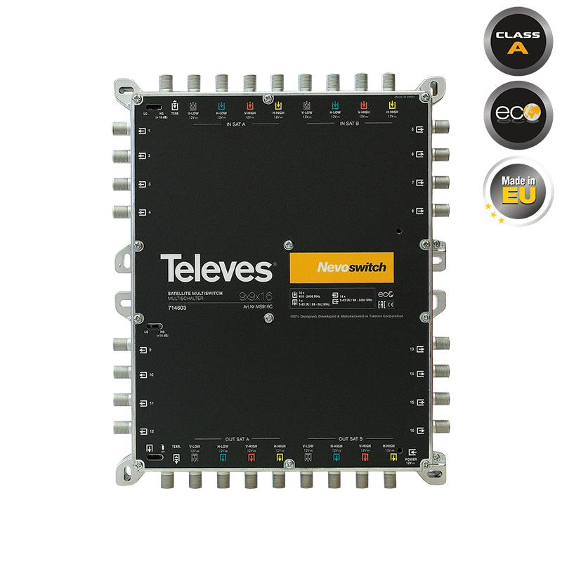 O 714603 NEVOSWITCH 9x9x16 ανήκει σε μιά νέα σειρά πολυδιακοπτών NEVOSWITCH της TELEVES. Με προσανατολισμό στον επαγγελματία και στην πλήρη ευελιξία της αρχικής εγκατάστασης αλλα και κάθε προγραμματισμένης ή απρογραμμάτιστης επέκτασης/προσθήκης, έχει την δυνατότητα να χρησιμοποιειθεί καί ως τερματικός και ώς διαδοχικός (cascadable). Μόνο με επιλογή 1 διακόπτη! Ευελιξία και στους τρόπους τροφοδοσίας: μέσω του Power DC Jack (12 Vdc) , μέσω του V-Low input (12 Vdc), μέσω των TERR input/οutput! Επιπλέον, δίνοντας 12 /18V σε οποιαδήποτε έξοδο, το DC τροφοδοτεί μεσω Terr και V-LOW input/output, προ-ενισχυτές, κεραίες B.O.S.S., LNB ή άλλους πολυδιακόπτες NEVOSWITCH, μέσω της επιλογής απο το Switch 1 (VDC). Η σειρά NEVOSWITCH σχεδιάστηκε και λειτουργεί με σύστημα ECO το οποίο προσαρμόζει την κατανάλωση ανάλογα με το φορτίο της συσκευής, κάθε στιγμή, διατηρώντας πάντα την χαμηλότερη δυνατή κατανάλωση ανάλογα με τις συνθήκες. Αν δέν είναι συνδεδεμένος κανένας χρήστης και δέν υπάρχει σύνδεση στα 220ν, η κατανάλωση θα πάει στα 0Α.