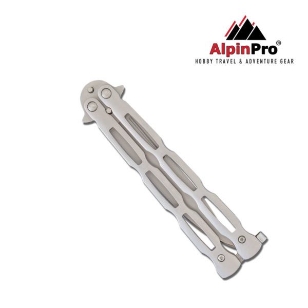Σουγιάς πεταλούδα από ανοξείδωτο ατσάλι από την εταιρία AlpiPro. Βάρος μόνο 85 γραμμάρια. Συνολικό μήκος σουγιά 23 εκατοστά.