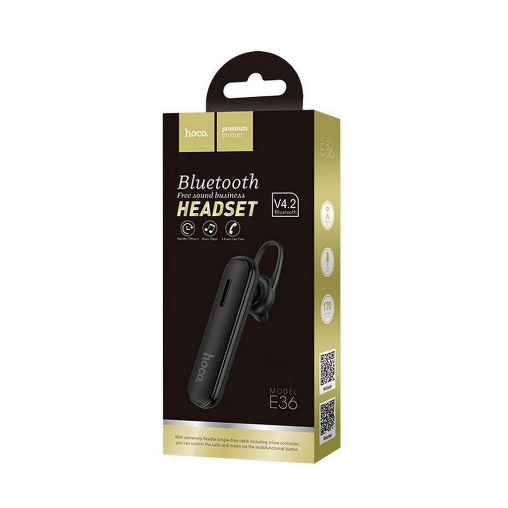 Bluetooth Stereo Headset Hoco E36 Μαύρο, εμβέλειας έως 10 μέτρα, με πλήκτρο απάντησης και έκδοση Bluetooth V4.2. Υποστηρίζει αναπαραγωγή μουσικής, βίντεο και κλήσεις σε Apple και Android, με καθαρό και συνεχή ήχο με πιο σταθερό σήμα. Ανάλογα το μοντέλο του κινητού που είναι συνδεδεμένο το Headset E36, σε ορισμένες συσκευές εμφανίζεται στην οθόνη του κινητού το επίπεδο της μπαταρίας, ώστε να ξέρετε ακριβώς πόση μπαταρία απομένει. Διάρκεια χρόνου αναπαραγωγής μουσικής και ομιλίας έως 4 ώρες, χρόνο αναμονής 170 ώρες και διάρκεια φόρτισης περίπου 2 ώρες. Διαθέτει μπαταρία 70mAh, ισχύς φόρτισης DC5V. Διαστάσεις προϊόντος 54x14x20mm και βάρος 7gr