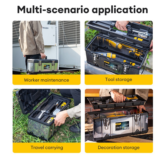 Εργαλειοθήκη Deli, ιδανική για την αποθήκευση διάφορων εργαλείων και εξαρτημάτων. Είναι κατασκευασμένη από ανθεκτικό πλαστικό υλικό με μεταλλικό κούμπωμα. Διαθέτει άνετη πτυσσόμενη λαβή, εσωτερικό δίσκο εργαλείων και εσοχή για ασφάλιση με λουκέτο.