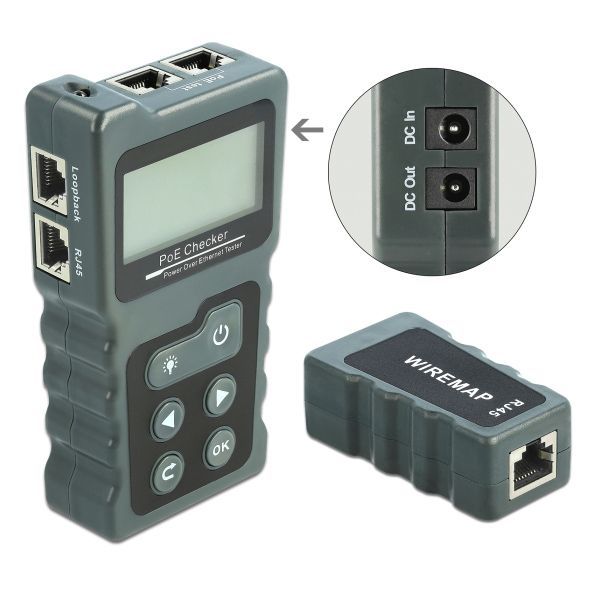 DELOCK tester καλωδίων με οθόνη 63110, RJ45, PoE, DC, γκρι