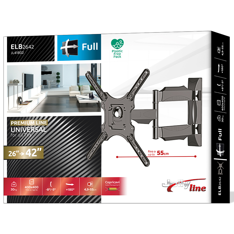 Η ρυθμιζόμενη βάση ELB-2642 JollyLine ΒΑΣΗ TOIXOY TV 26-42 Motion 30kg, προορίζεται για στερέωση τηλεόρασης ή οθόνης 26 έως 42 ιντσών και βάρους έως 30 κιλά, σε κάθετη επιφάνεια εσωτερικού χώρου. Ο λειτουργικός σχεδιασμός, βοηθά και στην διατήρηση της αισθητικής του σημείου, προσφέροντας απόκρυψη της όδευσης του καλωδίου της TV, στο τμήμα πίσω από την βάση. Με μόνο από 4,6 εκατοστά απόσταση από τον τοίχο, είναι ιδανική για χώρους όπως κουζίνες και υπνοδωμάτια. Το είδος προορίζεται για τοποθέτηση και επέμβαση, μόνο από εξειδικευμένο τεχνικό προσωπικό. Η επιφάνεια στήριξης πρέπει να πληρεί τις προϋποθέσεις στήριξης βάσει προδιαγραφών και χαρακτηριστικών της βάσης και των συσκευών η οποία αυτή στηρίζει. Το είδος προορίζεται για εγκατάσταση και χρήση μόνο σε εσωτερικό χώρο.
