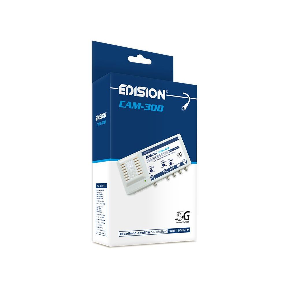 Ο EDISION CAM-300 είναι ενισχυτής Επίγειων Ψηφιακών καναλιών DVB-T/T2 και Ραδιοφωνικών FM, για μεγάλες εγκαταστάσεις κεραιοσυστημάτων (Κεντρική εγκατάσταση κτιρίου). Διαθέτει 3 ανεξάρτητες εισόδους σήματος, όπου η κάθε μία έχει το δικό της ρυθμιστικό ενίσχυσης, για την κατάλληλη επιλογή από τον τεχνικό. Παρέχει την δυνατότητα σύνδεσης 2 κεραιών UHF και μίας κεραίας FM στην είσοδο VHF/FM αλλά και τον συνδυασμό κεραίας UHF για τα Επίγεια Ψηφιακά κανάλια, μαζί με Μodulator σε διαφορετική είσοδο απο την κεραία, για την κατάλληλη απομόνωση και μίξη των σημάτων εισόδου και την σωστή διανομή προς τις τηλεοράσεις. Διαθέτει φίλτρο αποκοπής παρεμβολών 5G LTE για κάθε είσοδο UHF και το κύκλωμα του περιέχεται σε πλήρως μεταλλικό κέλυφος, για προστασία από ηλεκτρομαγνητικές παρεμβολές. Η μονάδα αυτή, βρίσκεται εντός κυτίου απο συνθετικό υλικό με συμπαγείς διαστάσεις, μαζι με το τροφοδοτικό της. Εξωτερικά τoυ κυτίου βρίσκονται οι ενδείξεις εισόδου και εξόδου του σήματος, η πρόσβαση στα ρυθμιστικά ανα είσοδο καθώς και ανεξάρτητη έξοδος ΤΕΣΤ [-20db] για δοκιμές.