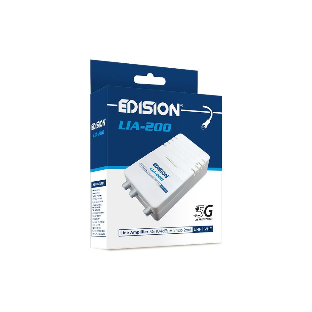 Ο EDISION LIA-200 είναι ενισχυτής γραμμής Επίγειων Ψηφιακών καναλιών DVB-T/T2 και Ραδιοφωνικών FM. Μπορεί να χρησιμοποιηθεί σε ομοαξονικό καλώδιο με τηλεοπτικό σήμα απο αρχικό ενισχυτή, για επιπλέον ενίσχυση εξασθενημένου τηλεοπτικού σήματος, προς ομάδα τηλεοράσεων του κτιρίου ή/και ανα διαμέρισμα/ομάδα τηλεοράσεων σε αυτό. Διαθέτει 1 κοινή είσοδο σήματος, για τις μπάντες UHF και VHF/FM, με ανεξάρτητο ρυθμιστικό ενίσχυσης για την κάθε μία, για την κατάλληλη επιλογή από τον τεχνικό. Με τις 2 εξόδους του, παρέχει την δυνατότητα σύνδεσης 2 γραμμών ομοαξονικού καλωδίου, για την αντίστοιχη διανομή προς τις τηλεοράσεις. Διαθέτει φίλτρο αποκοπής παρεμβολών 5G LTE και το κύκλωμα του περιέχεται σε πλήρως μεταλλικό κέλυφος, για προστασία από ηλεκτρομαγνητικές παρεμβολές. Η μονάδα αυτή, βρίσκεται εντός κυτίου απο συνθετικό υλικό με συμπαγείς διαστάσεις, μαζι με το τροφοδοτικό της. Διαθέτει κάλυμμα και εσωτερικά επάνω στον ενισχυτή, βρίσκονται οι ενδείξεις εισόδου και εξόδου του σήματος και η πρόσβαση στα ρυθμιστικά ανα μπάντα/συχνότητα σήματος εισόδου.