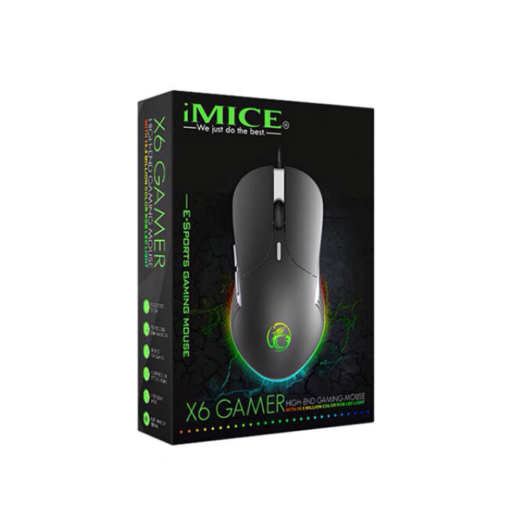 Ενσύρματο Ποντίκι iMICE X6 Gamer 6D με 6 Πλήκτρα, 3200 DPI και LED Φωτισμό. Μαύρο. Το ποντίκι που συνδυάζει χαρακτηριστικά gaming και επαγγελματικής ή καθημερινής χρήσης, χάρη στον εργονομικό σχεδιασμό του, την συμμετρική του κατασκευή και τις επιδόσεις που ικανοποιούν τις απαιτήσεις κάθε gamer. Με υψηλή ακρίβεια και την καινοτομία LED Breathing Light 7 χρωμάτων! Η ανάλυση έχει 4 ρυθμιζόμενα επίπεδα, ενώ το υλικό κατασκευής είναι απαλό για καλύτερη επαφή. Ιδανικό για κάθε χρήση και συμβατό με κάθε λειτουργικό με plug and play σύνδεση. Ανάλυση: 800/1200/2400/3200 DPI, Σάρωση εικόνας: 4000 frame/s, Ταχύτητα: 32 in/s, Ταχύτητα απόκρισης: 125 Hz/s, βάρος: 135 g, Τάση: DV 5V, 100 mA, Μήκος καλωδίου: 1.8 μ. Πλήκτρα: 6