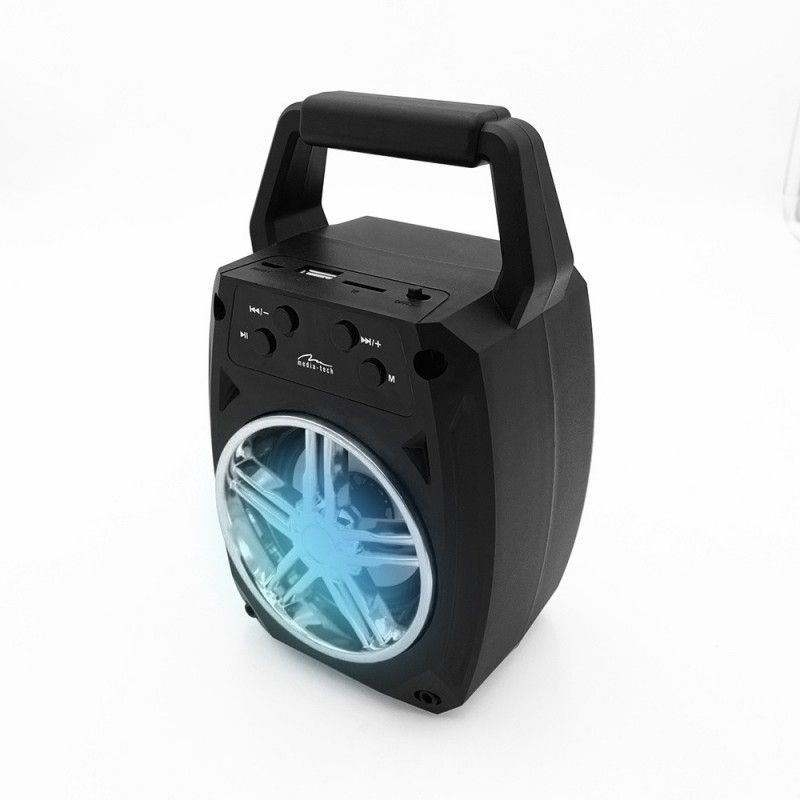 Φορητό Ηχείο Bluetooth Media-Tech Playbox Jive MT3170 30W, BT 5.0,AUX-IN, USB, Micro SD, MP3, Ραδιόφωνο Μαύρο. Το Playbox Jive είναι ιδανικό για οικιακή χρήση και για χρήση σε εξωτερικές εκδηλώσεις, μπορείς να απολαμβάνεις την μουσική σου παντού. Παράλληλα, διαθέτει πολύχρωμο φωτισμό LED. Χάρη στην ενσωματωμένη επαναφορτιζόμενη μπαταρία λιθίου με δυνατότητα έως 10 ώρες λειτουργίας και το βολικό μέγεθος το ηχείο μπορεί να μεταφερθεί εύκολα και παντού. Επιπλέον το ηχείο σας επιτρέπει να συνδέετε σχεδόν οποιαδήποτε πηγή ήχου, υποστηρίζει κάρτα microSD, συσκευές USB (π.χ. μονάδες flash) και πηγές ήχου. Η σύνδεση Bluetooth 5.0 σας επιτρέπει να ακούτε αρχεία μουσικής, τα οποία μπορείτε να μεταδώσετε ασύρματα από οποιαδήποτε συσκευή Bluetooth π.χ. τηλέφωνο, smartphone, tablet χωρίς καλώδια. Το Playbox Jive διαθέτει επίσης ενσωματωμένο ραδιόφωνο FM με αυτόματη σάρωση FM 87,8-108MHz. Στο επάνω μέρος της συσκευής υπάρχει μια λαβή με την οποία μπορείτε να μεταφέρετε το ηχείο παντού μαζί σας ενώ στο κάτω μέρος υπάρχει αντιολισθητική επιφάνεια για καλύτερη στήριξη. Ισχύς εξαγωγής: RMS 5W, PMPO 280W Απόδοση συχνοτήτων: 150~18000 Hz. Διαστάσεις: 120x98x198mm και Βάρος: 385g