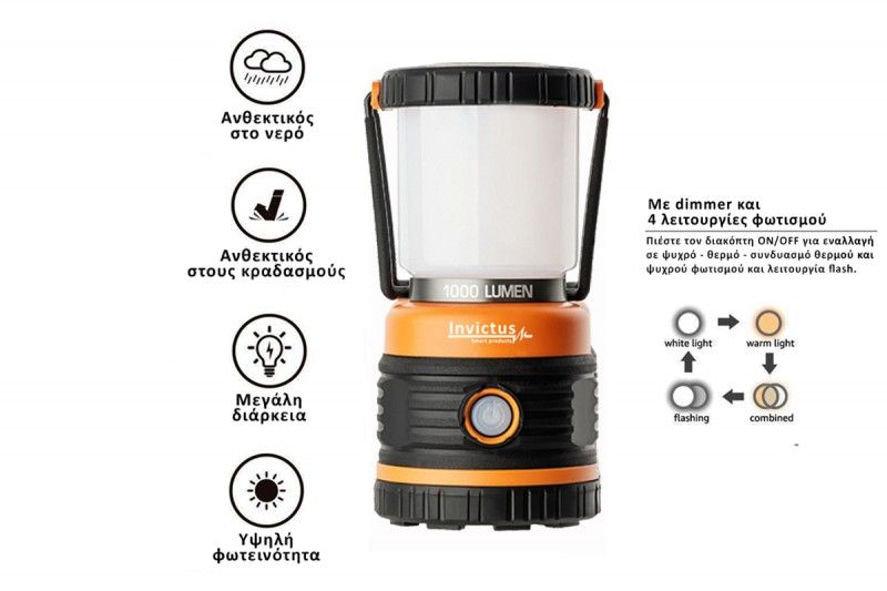 To INVICTUS INV-1000L είναι ένα πραγματικά εντυπωσιακό επαναφορτιζόμενο φανάρι κάμπινγ, με εξαιρετική ποιότητα κατασκευής και πλήρως ρυθμιζόμενη φωτεινότητα που φτάνει τα 1000 Lumens.
