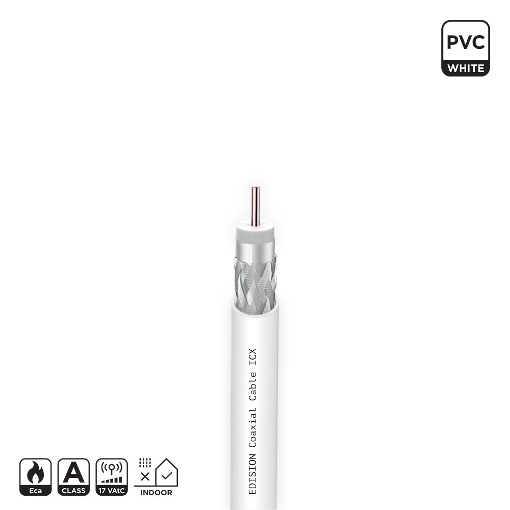 EDISION ΚΑΛΩΔΙΟ Coaxial ICX-100 CCS AL Eca PVC Λευκό 100m. Ομοαξονικό καλώδιο RG6 εσωτερικού χώρου, σε πλαστικό στροφείο 100 μέτρων, για διανομή σήματος Επίγειας Ψηφιακής και Δορυφορικής TV. Κατάλληλο και για σήμα κάμερας CCTV. Με αγωγό από επιχαλκωμένο σίδερο (CCS), διαθέτει ενισχυμένα μηχανικά χαρακτηριστικά ενώ το εξωτερικό του περίβλημα από PVC με διπλή θωράκιση τάξης Class A, χαρακτηρίζεται από ευλυγισία και προστασία από την περιβαλλοντική θερμότητα, με εξαιρετικές προδιαγραφές για την κατηγορία του. Συμβατό με όλα τα φις TV και F 7 χιλιοστών.