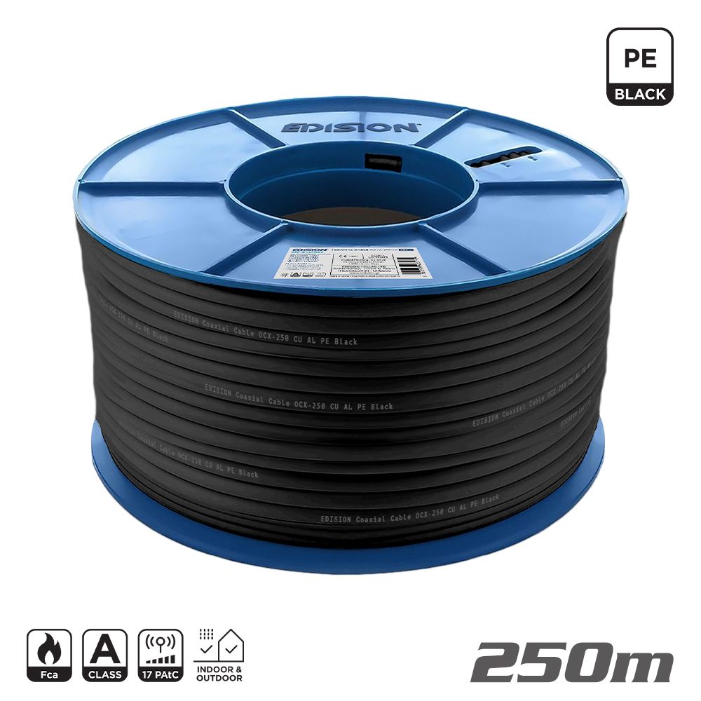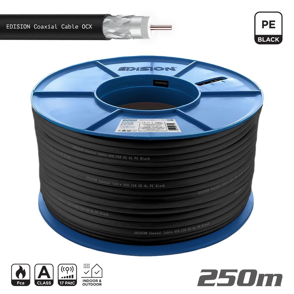 EDISION ΚΑΛΩΔΙΟ Coaxial OCX-250 CU AL Fca PE Μαύρο 250m. Ομοαξονικό καλώδιο RG6, ειδικό για εξωτερικό αλλά και εσωτερικό χώρο, σε πλαστικό στροφείο 250 μέτρων, για διανομή σήματος Επίγειας Ψηφιακής και Δορυφορικής TV. Κατάλληλο και για σήμα κάμερας CCTV. Με αγωγό από 100% χαλκό (CU), διαθέτει ενισχυμένα μηχανικά χαρακτηριστικά με εξωτερικό περίβλημα από PE, με διπλή θωράκιση τάξης Class A, προσφέροντας εξαιρετική αγωγιμότητα και χαμηλή εξασθένιση στο σήμα, σε όλο το φάσμα των συχνοτήτων. Διαθέτει εξωτερικό περίβλημα από ΡΕ για ανθεκτικότητα στο νερό και στα καιρικά φαινόμενα, για εγκατάσταση σε εξωτερικές οδεύσεις αλλά και όπου απαιτείται ομοαξονικό καλώδιο RG6 κορυφαίων προδιαγραφών. Συμβατό με όλα τα φις TV και F 7 χιλιοστών.