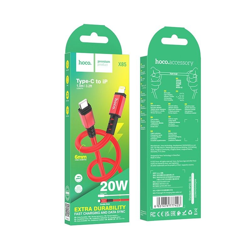 Καλώδιο Σύνδεσης Hoco X85 Strength USB-C σε Lightning PD20W Κόκκινο Υψηλής Αντοχής. Υποστηρίζει γρήγορη φόρτιση Apple PD20W. Κατασκευής OD 6mm, σούπερ παχύ καλώδιο, τραχιά υφή, μοναδικό στυλ. Μήκος: 1μ. και Βάρος: 50γρ.