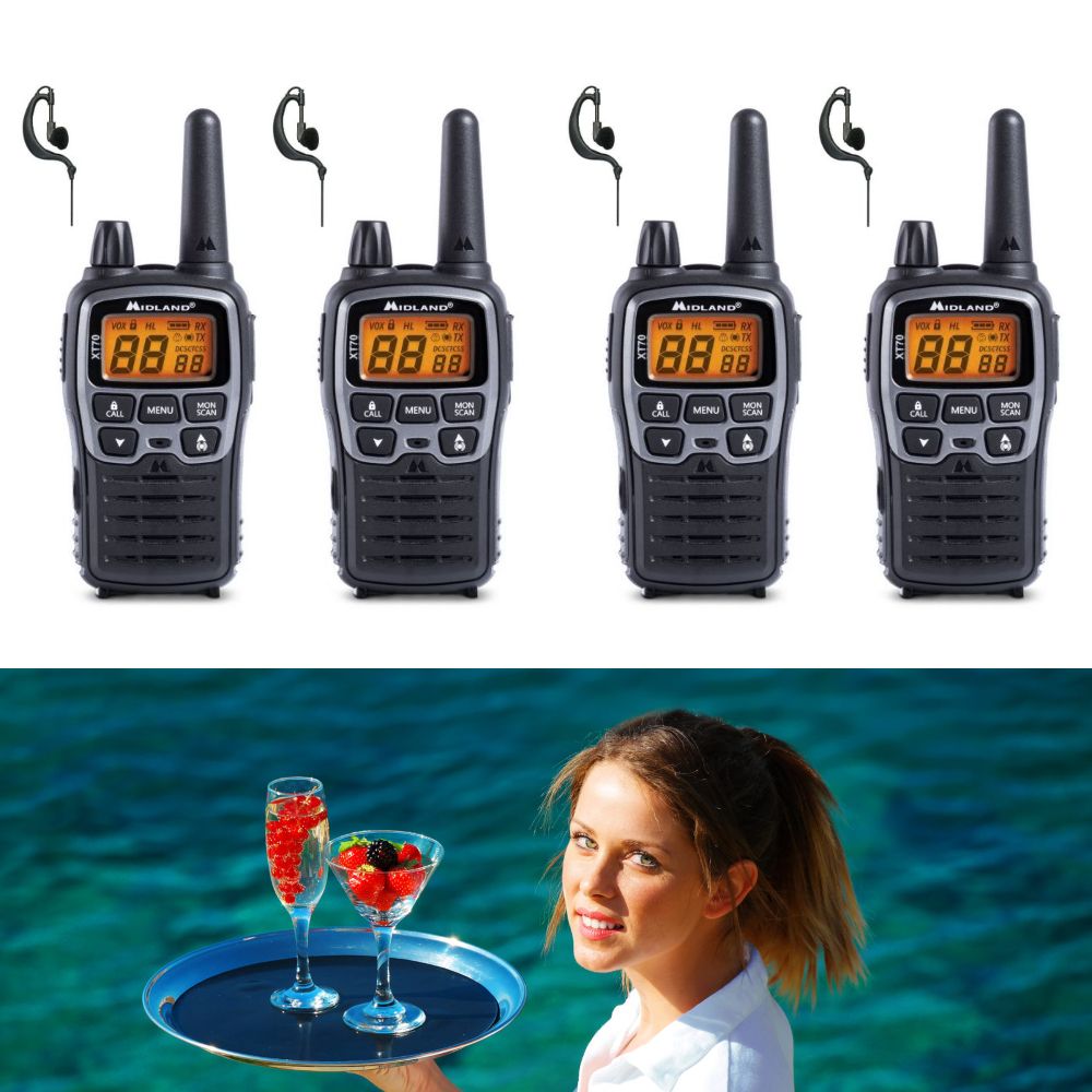 Ασύρματοι πομποδέκτες (Walkie Talkies) Midland XT70 ελεύθερης χρήσης ιδανικοί για ενδοεπικοινωνία σε Ξενοδοχεία, Bar, Clubs, Εστιατόρια, Καφετέριες, Εμπορικά Καταστήματα, Ασφάλεια Εγκαταστάσεων, Συνέδρια, Αθλητικές Εκδηλώσεις, Ταξίδια, Εκδρομές και Εξωτερικές εργασίες και δραστηριότητες παντός τύπου.