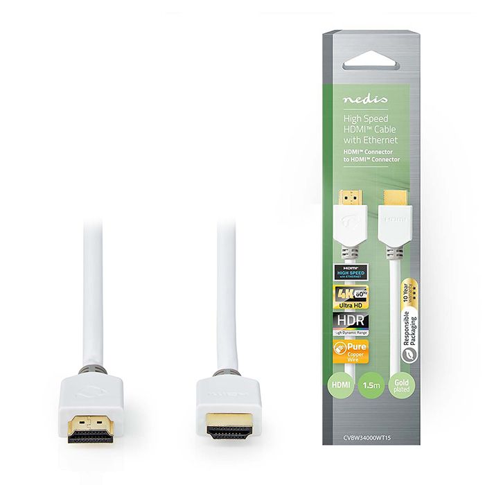 Καλώδιο HDMI αρσ. - HDMI αρσ. 1.5m με επίχρυσες επαφές σε άσπρο χρώμα.