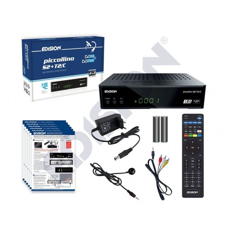Ο PICCOLLΙΝΟ S2+T2/C είναι ο νέος ''μικρός'' H.265/HEVC 10 Bit COMBO δέκτης της EDISION με δύο tuner, θύρα Card Reader και δυνατότητα επιλογής DVB-S & DVB-S2 για το δορυφορικό tuner αλλά και DVB-T/T2 ή DVB-C tuner. Με νέας γενιάς επεξεργαστή, σας προσφέρει ταχύτατη εναλλαγή στο μενού και στα κανάλια, ενώ διαθέτει αποθηκευτική ικανότητα έως 6000 καναλιών. Η θύρα LAN στα 100Mbps για πρόσβαση σε web εφαρμογές μαζί με τις λειτουργίες Media Player που διαθέτει, σε συνδυασμό με το εκλεπτυσμένο, ποιοτικό 2-σε-1 τηλεχειριστήριο EDI-RCU 2 Learn Slim για τηλεχειρισμό του δέκτη και 5 λειτουργιών της TV, θα κάνουν ακόμα πιο διασκεδαστική και απολαυστική την χρήση των πολλών, αγαπημένων σας λειτουργιών. Φυσικά, συνοδεύεται και απο την εγγύηση και την υποστήριξη της EDISION.