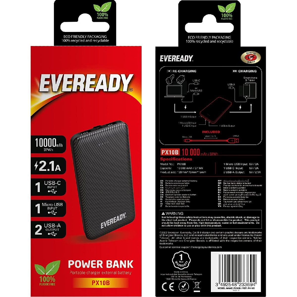 Power Bank Energizer Eveready Slim 10000mAh 2A  με 2x USB 2.0 και LED Ένδειξη Μπαταρίας. Χωρητικότητα: 10000mAh.A+ Class Li-Polymer μπαταρία. Είσοδος Micro & USB-C  5V 2A. Έξοδος 2 USB-A  5V 2A. Υλικό: Πλαστικό. Συμπεριλαμβάνεται: Καλώδιο Φόρτισης Micro-USB. Βάρος: 194g