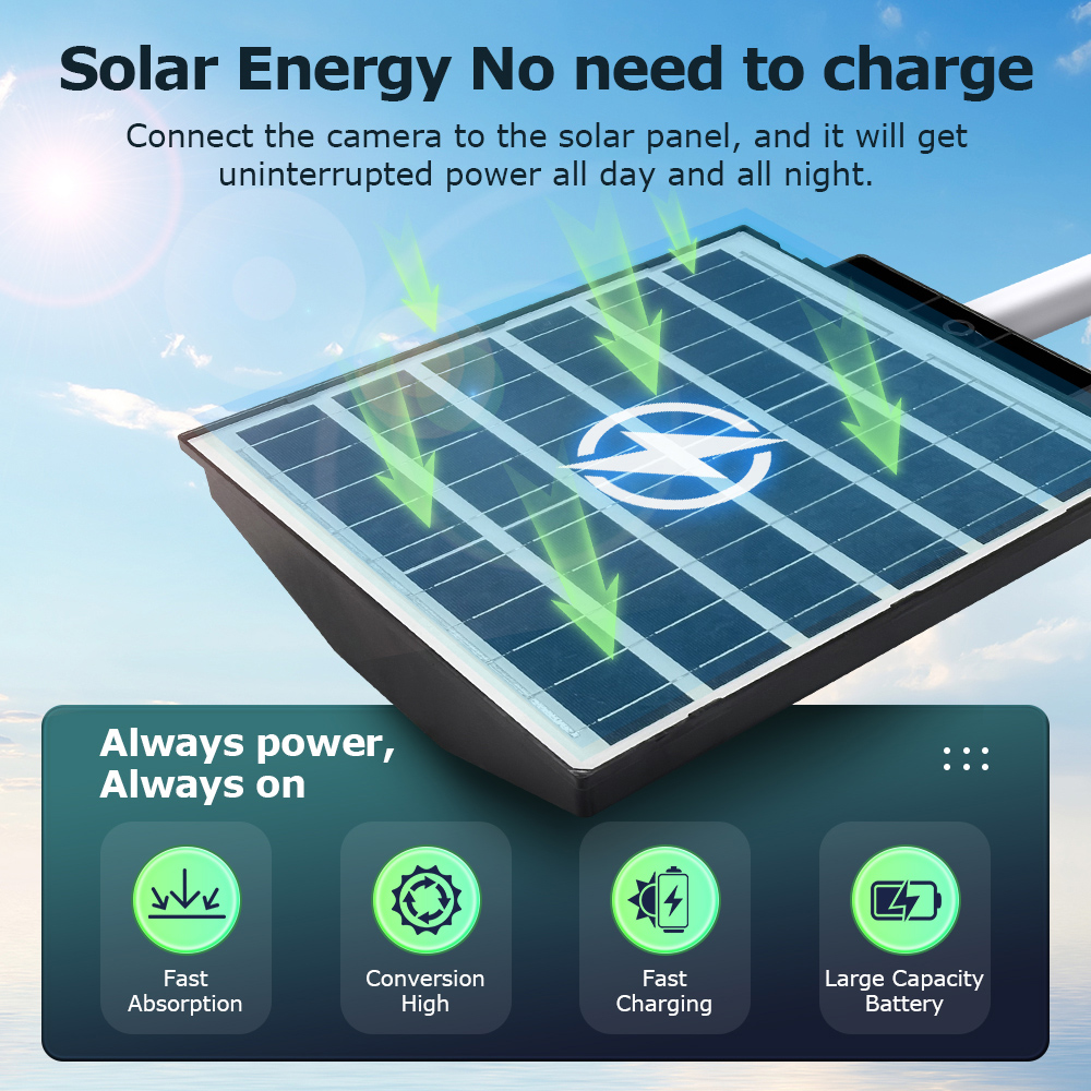 Τόσο η κάμερα όσο και ο προβολέας ενσωματώνουν μπαταρία η οποία επαναφορτίζεται με ηλιακή ενέργεια χάρη στο ηλιακό πάνελ.