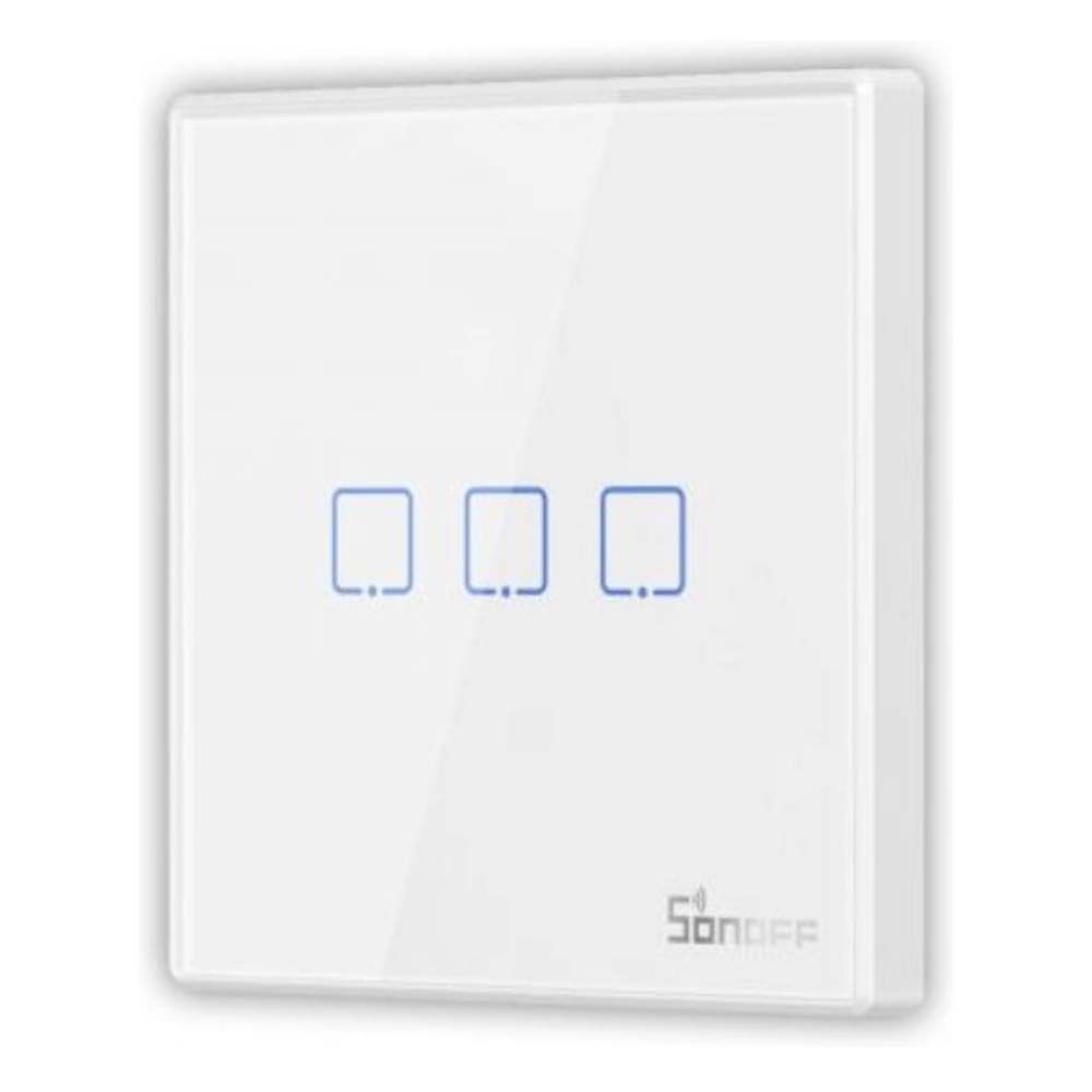 Τριπλός εξωτερικός διακόπτης τοίχου της Sonoff, αφής, σε λευκό χρώμα. Περιλαμβάνει τον μηχανισμό, τη μετώπη και το πλαίσιο του διακόπτη. Διαθέτει βοηθητικό λαμπάκι. Χρησιμοποιείται για τον έλεγχο του φωτισμού σας. Μπορεί να συνεργαστεί με άλλες έξυπνες συσκευές μέσω της εφαρμογής Alexa.
